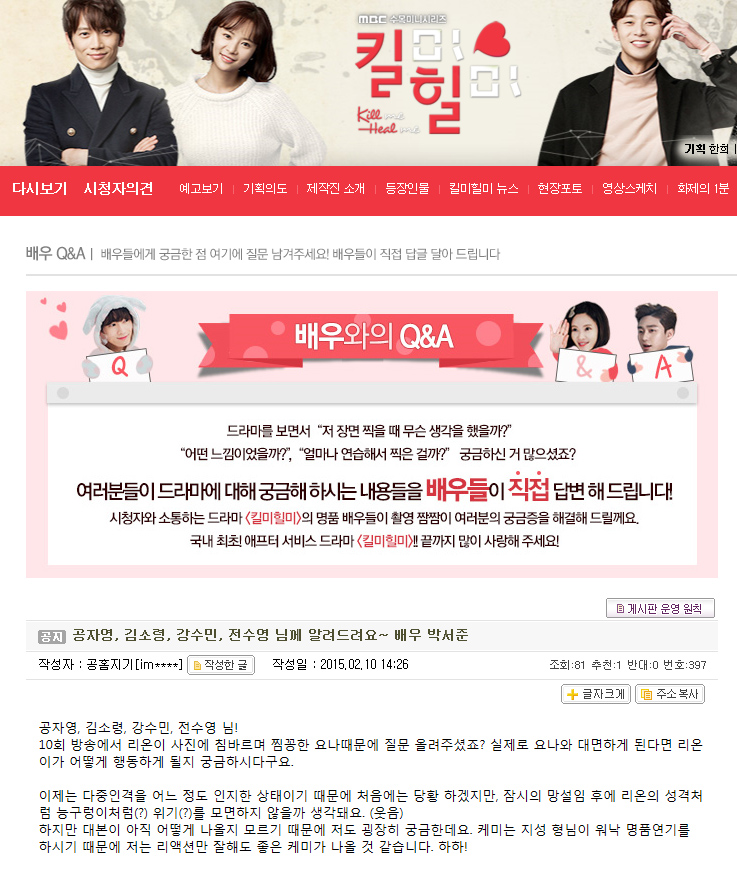 ☞ MBC <킬미힐미> 박서준의 Q&A 답변글 보러가기