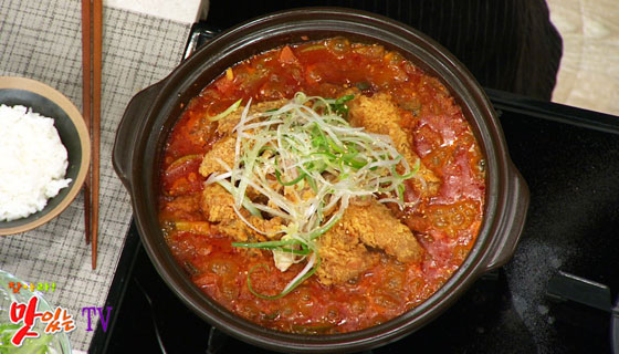 5. 끊는 국물에 치킨을 넣고 살짝 끓여, 채친 대파를 올려 마무리 한다.