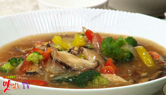 5. 된장 ½큰술을 풀고, 까나리 액젓으로 맛을 내고 녹말물을 넣어 걸쭉하게 소스를 만든다.