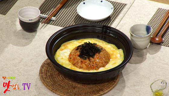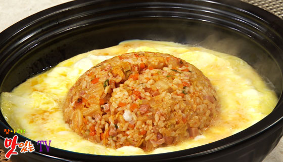 둥근 팬을 달군 후 볶음밥을 그릇에 담아 뒤집어 둥글게 올린 후 남은 공간에 모차렐라치즈를 솔솔 뿌린다. 그리고 마지막으로 달걀 물을 뿌려 익히면 치즈누룽지의 띠가 생기면서 우주선 모양의 김치볶음밥 완성!