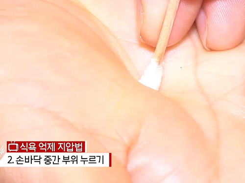 공복감을 느낄 때는 손바닥 중간 부위를 면봉으로 꾹 눌러주면 대뇌를 자극해 식욕을