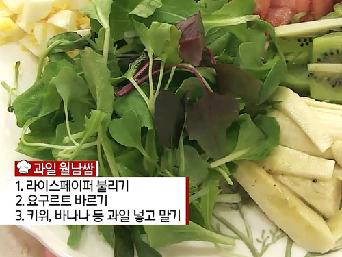 불린 다음 요구르트를 발라 키위, 바나나 등 과일을 넣고 말아주면 완성된다.