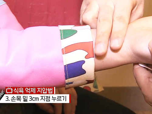 손목 아래 3cm 부위 역시 자극을 해주면 스트레스를 해소시켜 식욕을 줄여주고, 귀 뒤쪽 뼈