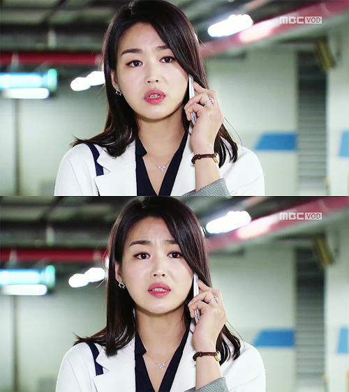 이 장면에서 송이우는 네이비 컬러의 브이넥 블라우스와 함께 여성스러운 플라워 패턴 스커트를 착용해 눈길을 끌었다. 여기에 송이우는 화이트 컬러의 자켓과 함께 신비로운 네이비 컬러의 사각 스톤과 투명한 미러 스톤으로 깔끔하면서도 세련미 넘치는 스타일을 완성했다.