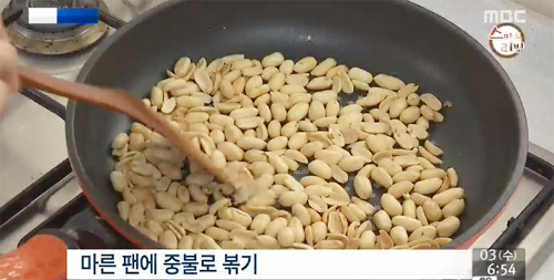 땅콩을 넣고, 타닥타닥하는 소리가 날 때까지 중불로 볶아준다.