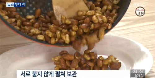 커피 땅콩이 완성되는데 식힐 땐 서로 붙지 않게 펼쳐 두는 게 효과적이다.