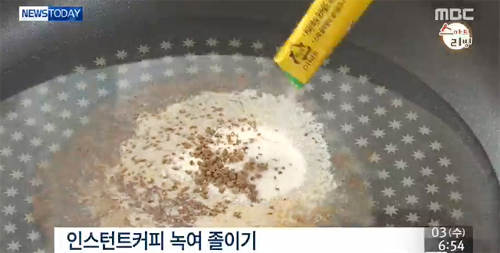 커피 땅콩의 핵심, 시럽인데 프라이팬에 물을 한 컵 붓고 인스턴트커피를 넣어 녹여준다.