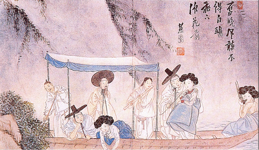 | 단원 신윤복의 '주유청강' ©공유마당, 한국저작권위원회 강에서 풍류를 즐기는 젋은 선비들과 기생들을 그린 이 풍속화를 통해 18세기 당시 남자들이 입었던 다양한 포와 여인들의 차림새(몸에 꼭 맞는 짧은 길이의 저고리와 항아리형의 풍성한 치마)를 살펴볼 수 있다. |