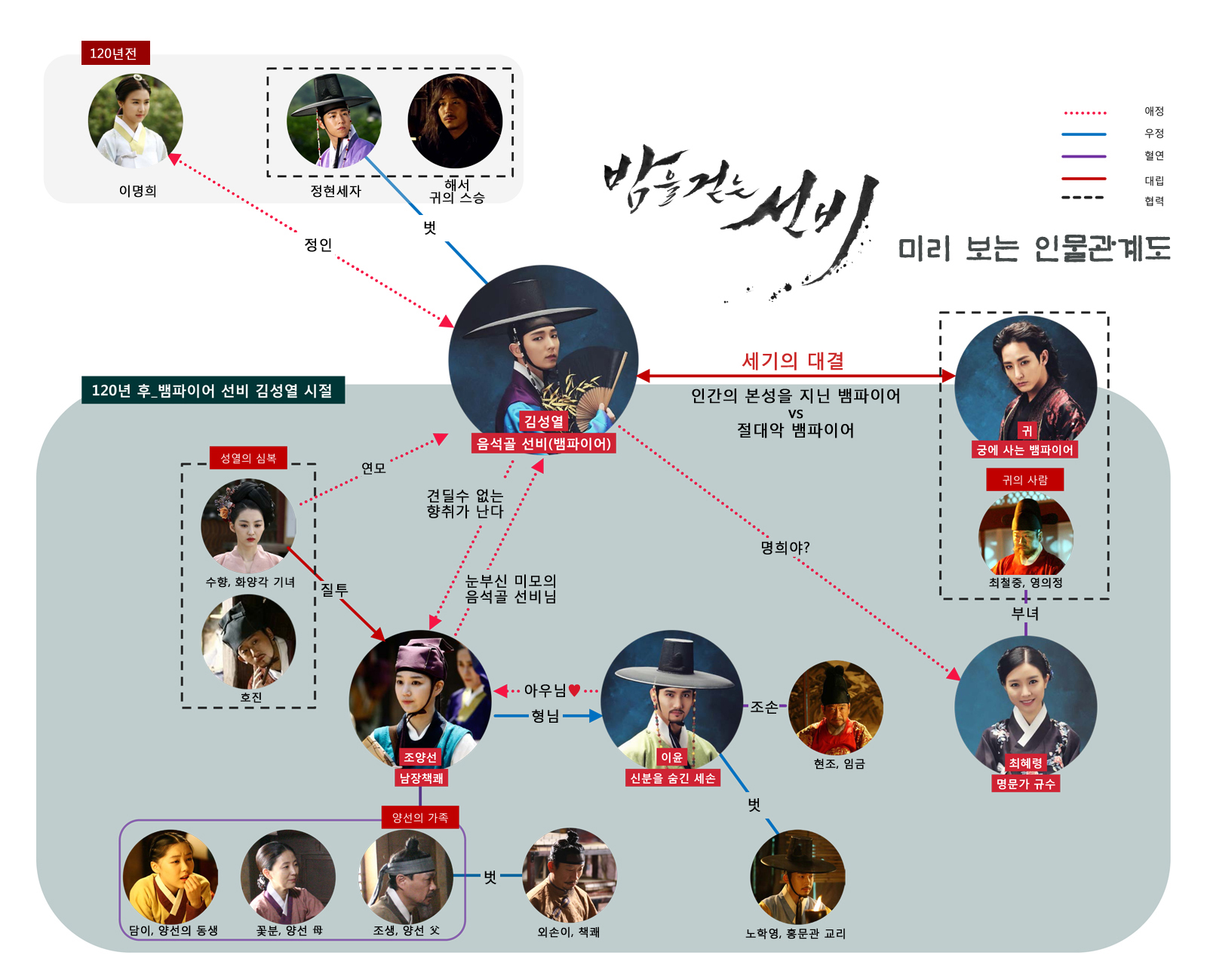 <밤을 걷는 선비>의 ‘미리 보는 인물관계도’에는 극을 이끌어가는 뱀파이어 선비 김성열을 중심으로 등장인물들이 퍼즐처럼 펼쳐져 있어 어떤 이야기를 그려낼지 궁금증을 자극한다.