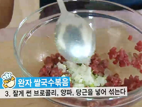 다진소고기, 양배추, 맛술, 참기름, 불린 쌀국수, 브로콜리, 당근, 양파, 간장, 올리고당