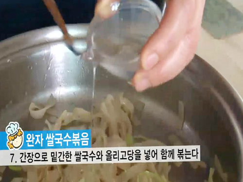 8. 불린 쌀국수를 간장에 밑간해서 올리고당을 넣고 함께 볶아준다.