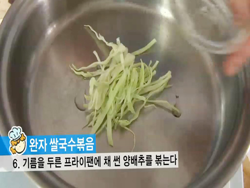 7. 기름을 두른 프라이팬에 채 썰어둔 양배추를 볶아준다.