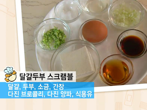 두부, 달걀, 소금, 간장, 다진 브로콜리, 다진 양파, 식용유
