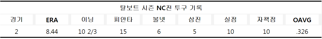 탈보트의 복귀전 상대는 NC 다이노스다. 탈보트는 이전 NC전에서 부진했다. 2경기에서 10⅔이닝 15피안타 10실점 하며 평균자책점 8.44를 기록했다. 한화 이글스의 연패를 탈출과 SK, KIA와 벌이고 있는 5위 경쟁에 유리한 고지에 올라서기 위해서는 탈보트의 활약이 필요하다.