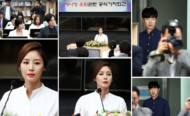 공개된 사진 속 레나는 흰 셔츠를 단정히 입고 단상에 앉아 무언가를 발표하고 있다. 붉은 립스틱의 레나는 화려해 보이긴 하지만 눈빛은 슬픔에 젖어있어 그녀의 심경 변화가 읽혀진다. 또 기자들 틈에 선 채 레나의 모습을 지켜보는 민준(이종혁)의 모습도 보인다.