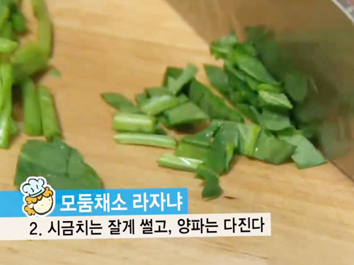 2. 이어서 건강에 좋은 시금치를 잘게 썰어주고, 양파도 역시 잘게 다져준다.