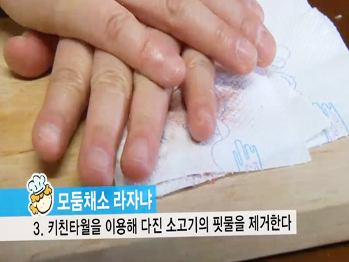 3. 이번에 핏물제거를 위해 다진 소고기를 키친타월로 꾹꾹 눌러준다.