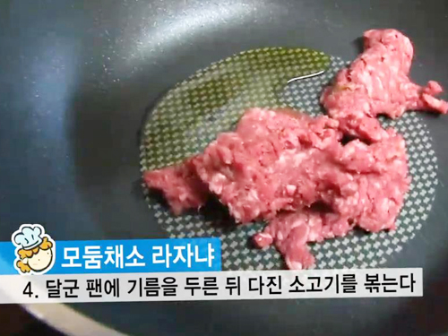 4. 기름을 두른 팬에 다진 소고기를 볶아준다.
