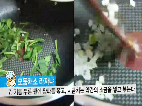 7. 기름 두른 팬에 양파와 시금치도 각각 따로 볶아주는데 양파에는 소금을 넣지 않고,