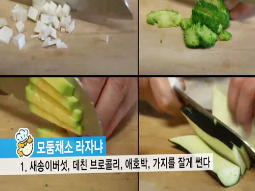 1. 라자냐 사이사이에 들어갈 새송이버섯, 데친 브로콜리, 애호박, 가지를 잘게 썰어준다.