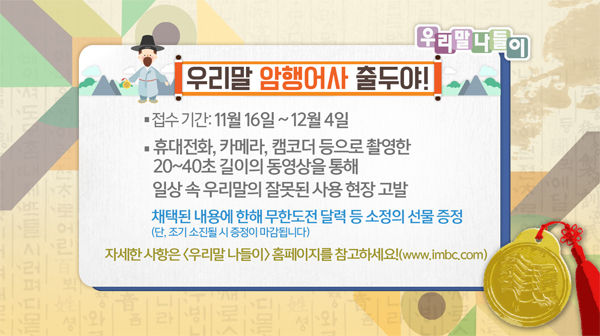 16일(월) MBC 측은 “여러분이 우리말 암행어사가 되어 주세요! <우리말 나들이>가 마련한 ‘우리말 암행어사 출두야!’를 소개합니다.”라는 글과 함께 시청자들을 대상으로 한 이벤트를 오픈했다.
