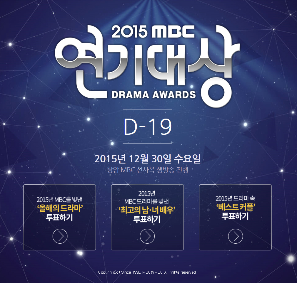[2015 MBC 연기대상]의 인기상과 베스트 커플상, 올해의 드라마상을 뽑는 인터넷 투표가 10일(목)부터 imbc 홈페이지를 통해 시작됐다.