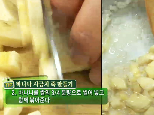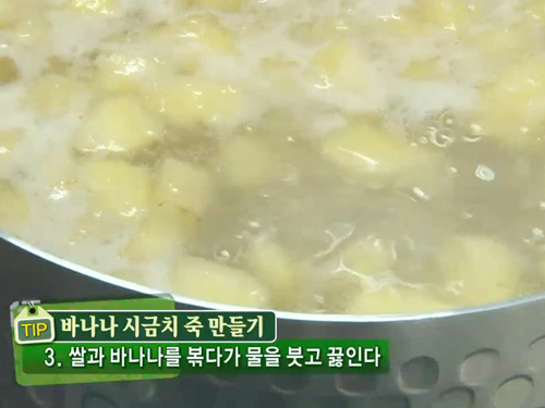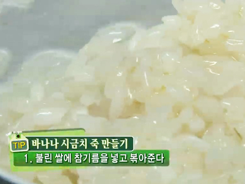쌀과 바나나를 볶다가 물을 붓고 끓여준다.