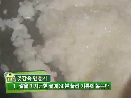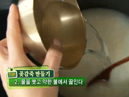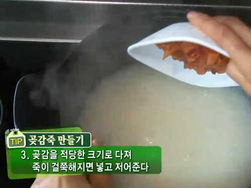 곶감을 적당한 크기로 다져 죽이 걸쭉해지면 넣고 저어주면 완성되는데 곶감을 죽에 빨리