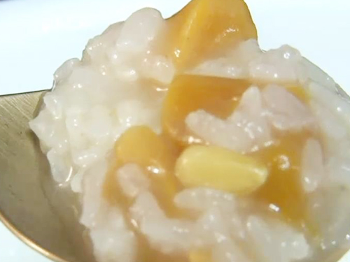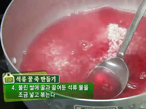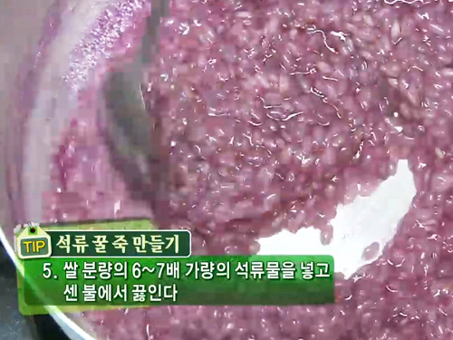 쌀 분량의 6~7배 가량의 석류물을 넣고 센 불에서 끓여주면 석류 꿀 죽이 완성된다.