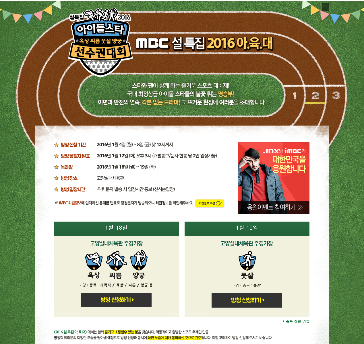 2016년 설특집 MBC <아이돌스타 육상 씨름 풋살 양궁 선수권 대회>(이하 아육대)가 2016년 방청신청 페이지를 오픈하면서 시청자들의 눈길을 모으고 있다.