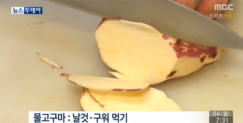 고구마를 더 건강하게 먹으려면 무김치나 사과와 함께 먹는 게 좋다.