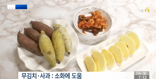 사과는 잦은 가스 배출을 막아주고 무김치는 소화를 도와준다.