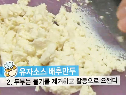 2. 그리고 면포를 사용해 두부의 물기를 꼭 짜서 제거하고 칼등으로 으깨준다.