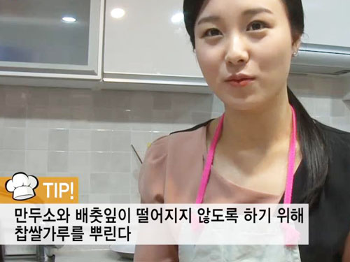 TIP.1 만두소와 배춧잎이 떨어지지 않도록 하기 위해 찹쌀가루를 뿌려준다.