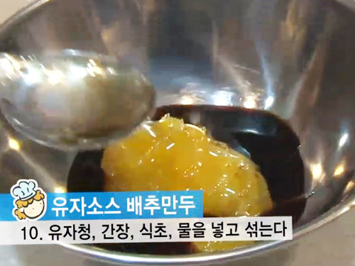 10. 만두가 쪄지는 사이에 유자청, 간장, 식초, 물을 넣고 섞어 소스를 만들어준다.