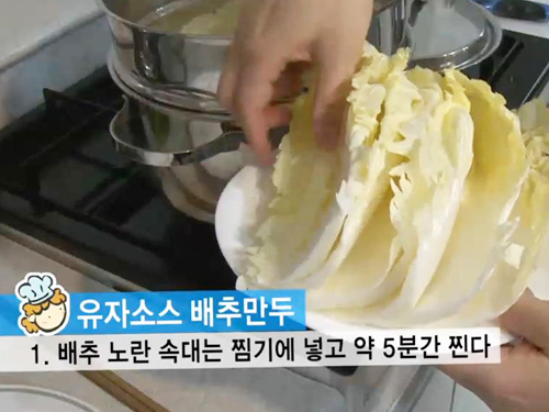 1. 배추에 노란 속대를 찜기에 넣고 약 5분간 쪄준다.