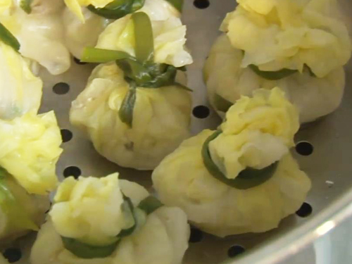 8. 배춧잎에 만두소를 넣고 복주머니 모양으로 감싼 뒤, 데친 실파로 배추를 묶어준다.