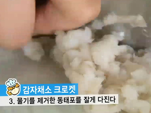 3. 동태포는 물기를 제거한 다음 잘게 다져준다.
