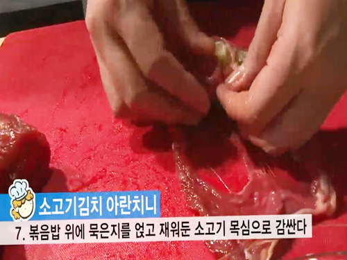 7. 그리고 볶음밥 위에 묵은지를 얹고 재워둔 소고기 목심으로 감싸준다.