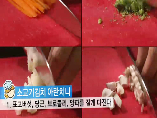 소고기 목심, 양파, 당근, 표고버섯, 브로콜리, 스트링치즈, 흰 밥, 씻은 묵은지,