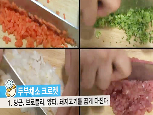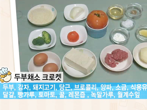 두부, 감자, 돼지고기, 당근, 브로콜리, 양파,소금, 식용유, 달걀, 빵가루, 토마토,