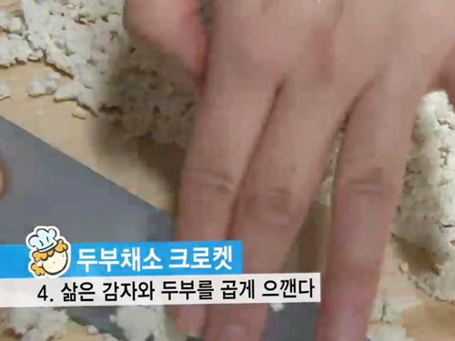 4. 다음은 삶은 감자와 물기를 짠 두부를 곱게 으깨준다.