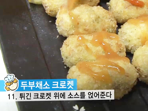 11. 마지막으로 튀긴 크로켓 위에 소스를 얹어주면 두부채소 크로켓이 완성된다.