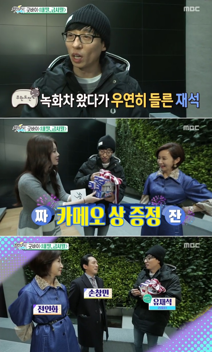 이에 유재석은 ‘무한도전’ 촬영차 지나는 길에 인사차 왔다고 밝혔고, 이때 신고은이 나서며 유재석에게 ‘카메오 상’을 증정하며 ‘카메오’ 과자를 선물로 안겨 웃음을 자아냈다.