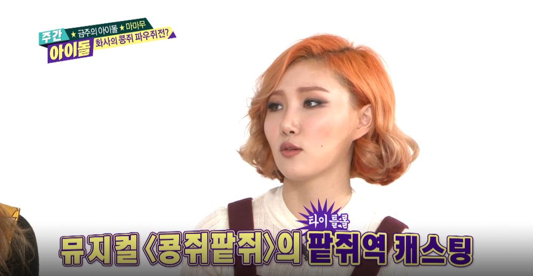 이날 ‘아이돌 콜센터 콜콜콜’ 코너에서 한 팬이 화사에게 “팥쥐 연기를 해달라”고 부탁했다. 이에 MC 데프콘이 팥쥐 역 비화에 관해 묻자, 화사는 “어릴 때 뮤지컬 <콩쥐팥쥐>에서 팥쥐로 캐스팅된 적이 있다”고 밝혔다.