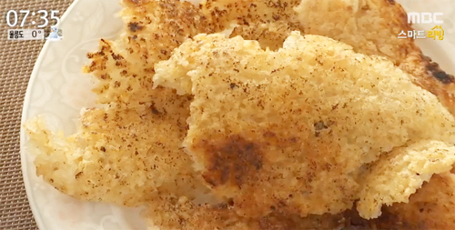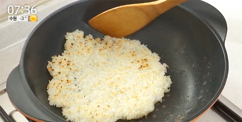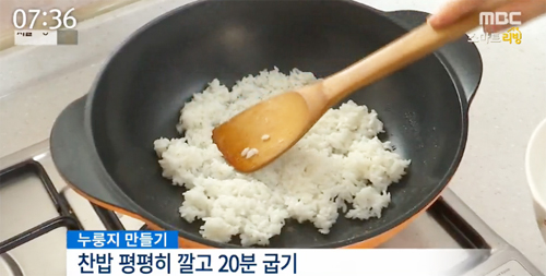윗면이 살짝 마를 때 한 번 뒤집어 5분쯤 두면 노릇노릇한 누룽지가 된다.