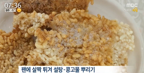 여기에 팬에 살짝 튀겨내고서 설탕이나 콩고물을 뿌려 먹으면 맛 좋은 누룽지튀김 완성이다.