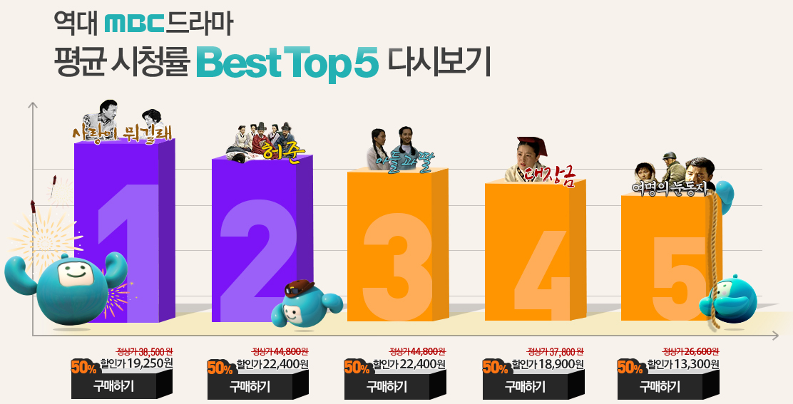 또한 역대 MBC 드라마 중 가장 높은 평균시청률을 기록하며 국민드라마로 불리웠던 <사랑이 뭐길래>(59.6%), <허준>(53%), <아들과 딸>(49.1%), <대장금>(46.3%), <여명의 눈동자>(44.3%)의 TOP 5 드라마 역시 50% 할인된 가격에 판매되고 있다.