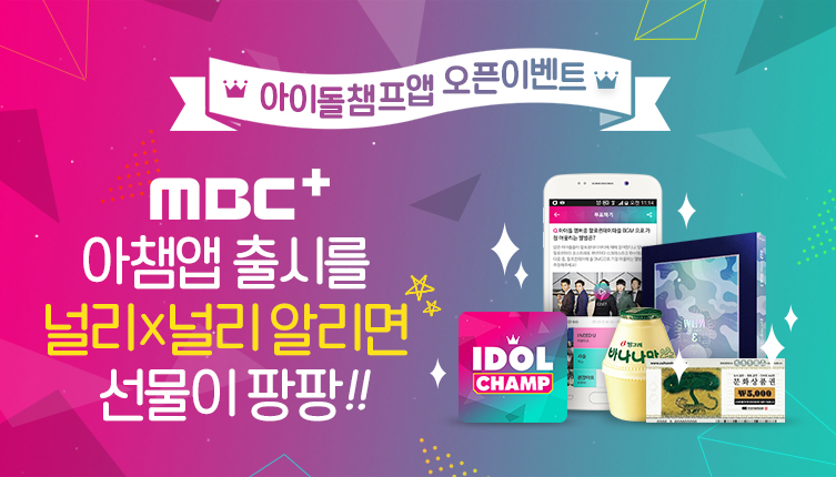 20일(수) MBC플러스는 네오위즈게임즈와 함께 TV 프로그램과 연계하여 실시간으로 참여하는 모바일 앱서비스인 ‘아이돌챔프’에서 서비스 출시를 기념한 다채로운 이벤트를 진행한다고 밝혔다.