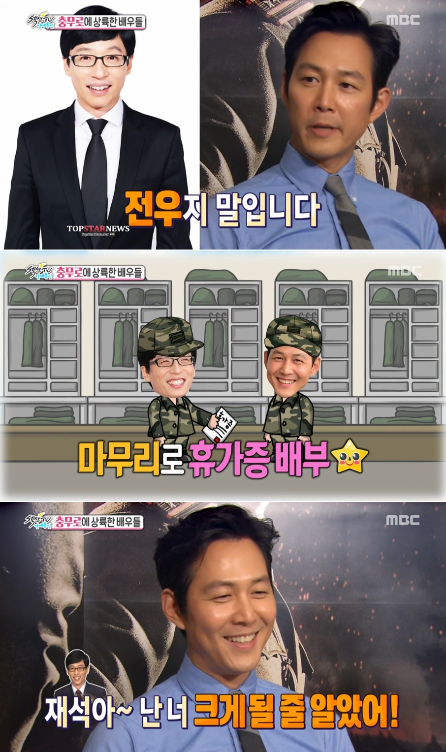 이정재는 유재석과는 군대 동기라고 밝히며 “당시 문화선전대라는 것을 준비도 하고 예하 부대 공연도 다니고 했다”고 설명했다.